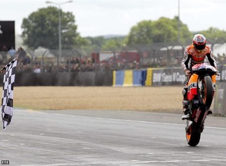 LE MANS, Francia.- El australiano Casey Stoner (Honda) logró este domingo la victoria de la carrera de MotoGP del Gran Premio de Francia en el circuito Bugatti en Le Mans, en la cuarta manga del Mundial, por delante de los italianos Andrea Dovizioso (Honda) y Valentino Rossi (Ducati).