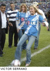 La artista norteamericana estuvo presente en el escenario por invitación del ex dirigente Omar Quintana, quien pidió a la dirigencia actual de Emelec que la reciba.