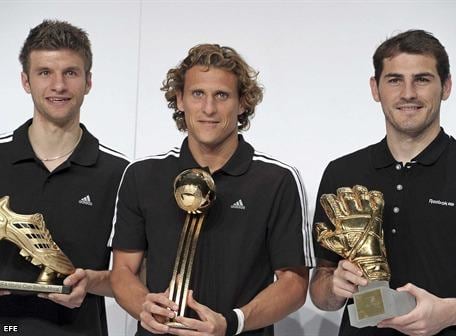HERZOGENAURACH, Alemania.- El uruguayo Diego Forlán, mejor jugador del Mundial de fútbol de Sudáfrica-2010, el joven alemán Thomas Müller, máximo goleador, y el español Iker Casillas, mejor arquero de la justa ecuménica, recibieron sendos trofeos este martes en Herzogenaurach, Alemania.