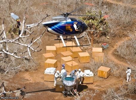 Un helicóptero sobrevuela la isla Rábida, en el archipiélago de Galápagos, y deja caer miles de pastillas de veneno para eliminar ratas, una plaga que amenaza principalmente a las aves endémicas que habitan en este pedazo de suelo agreste, lleno de cactos y arbustos grises similares al muyuyo, que se halla entre aguas del Pacífico sur.