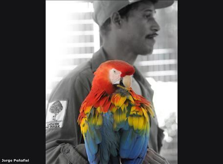 Como un niño que pidió ser cargado por su padre y luego no quiere colocar sus pies en el suelo, un guacamayo escarlata se aferra al brazo de su cuidador y camina hacia los hombros negándose rotundamente a regresar a la rama dentro de su jaula. Se trata de Alfonso, el guacamayo, y Ramón, su cuidador, en el Centro de Rescate de la Fundación Pro Bosque, en el Bosque Protector Cerro Blanco.