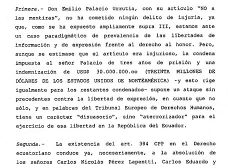 Un segundo análisis académico jurídico sobre la sentencia contra EL UNIVERSO coincide con las conclusiones del profesor Abraham Castro Moreno, especialista en Derecho de la Universidad Carlos III de Madrid, en cuanto que la condena contra la compañía, sus directivos y el exeditor de Opinión, Emilio Palacio, no tienen asidero en la dogmática penal contemporánea.