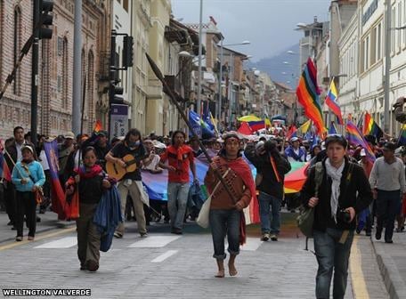 Indígenas y campesinos de Azuay ingresaron a las 17:00 de hoy al parque de San Blas, en el Centro Histórico de Cuenca, en su quinto día de caminata.
