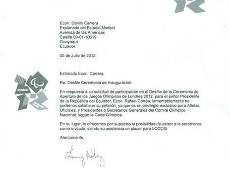 El Comité Olímpico Internacional (COI) descartó hoy, mediante carta enviada al titular del COE, Danilo Carrera, que el presidente de Ecuador, Rafael Correa, participe en el desfile de las delegaciones en la ceremonia inaugural de Londres 2012, prevista para mañana.