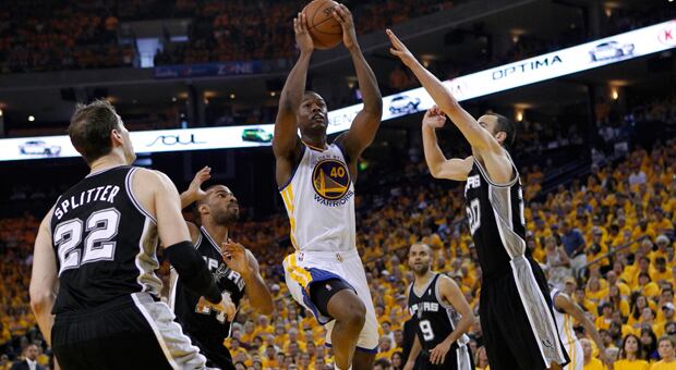 Los Warriors de Golden State anotaron nueve puntos seguidos en el tiempo extra, y con 71 unidades combinadas de Harrison Barnes, Stephen Curry y Jarrett Jack derrotaron la noche del domingo 97-87 a los Spurs de San Antonio, en los playoffs por las semifinales de la Conferencia Oeste de la NBA.