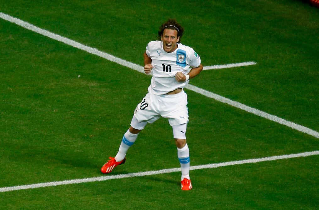 El delantero Diego Forlán jugó su partido 100 y le dio el triunfo a la celeste.