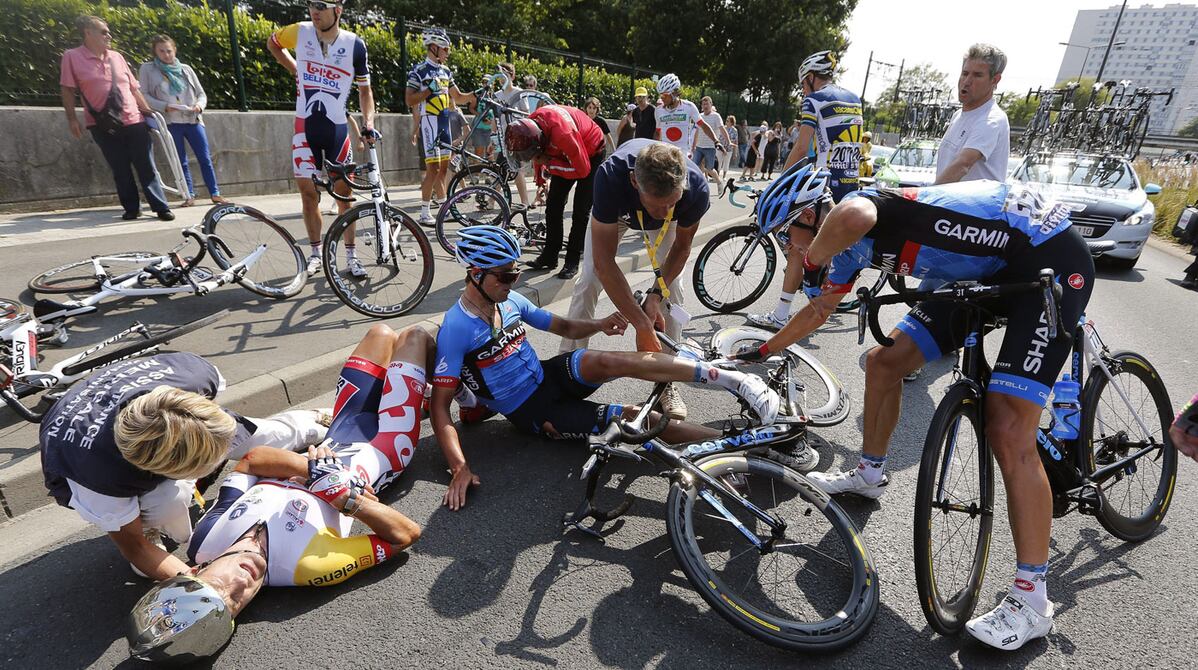 A 2 km del final una espectacular caída, que involucró a una veintena de ciclistas, ocasionó lesiones al neozelandés Gregory Henderson (i) y el retiro del noruego Edvald Boasson Hagen, por fractura de clavícula.