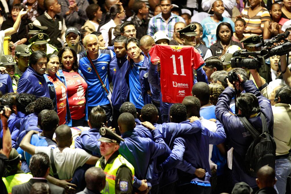 Rafael Correa, presidente de la República, estuvo anoche en el coliseo General Rumiñahui, donde es velado Christian Benítez; al mandatario lo acompañaron el vicepresidente Jorge Glas, varios ministros y otras autoridades del Gobierno. “Hasta siempre, eterno goleador”, dijo Correa en un discurso frente al féretro del Chucho.