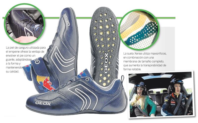 Geox, el proveedor de calzado de la escudería Red Bull para sus pilotos y mecánicos, diseñó el primer zapato de carrera transpirable con suela anatómica y flexible de Xense.