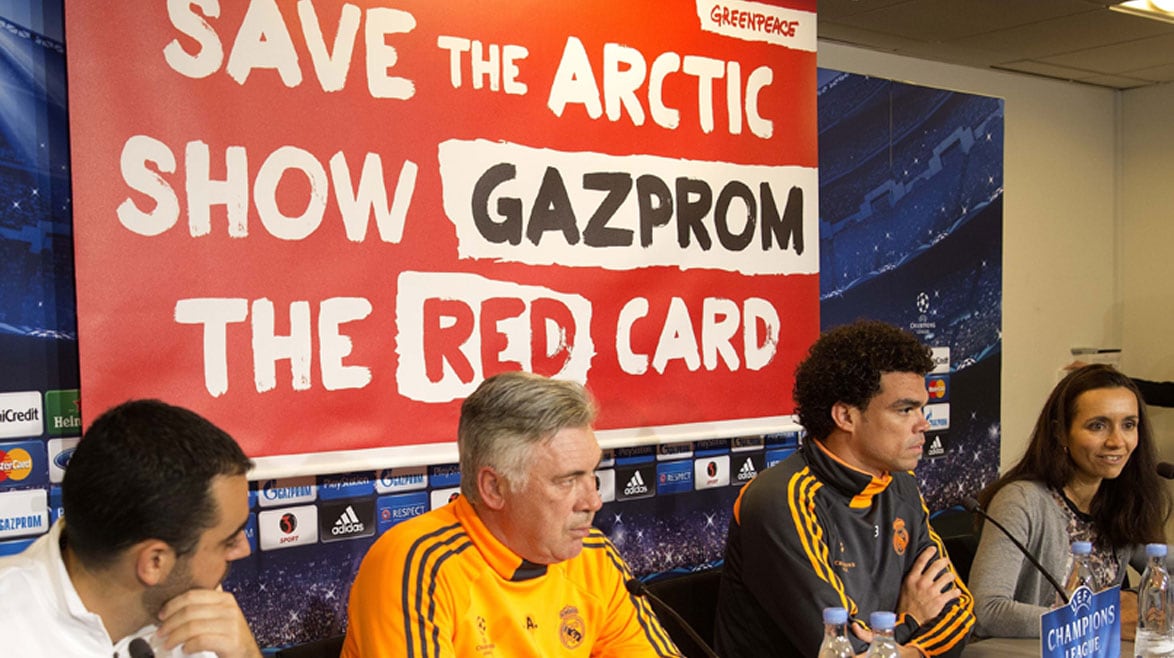La conferencia de prensa del Real Madrid este lunes, antes del partido de la Liga de Campeones contra el FC Copenhagen, se vio brevemente interrumpida, cuando una pancarta de Greenpeace contra la petrolera rusa Gazprom tapó el panel publicitario desplegado detrás del entrenador Carlo Ancelotti.