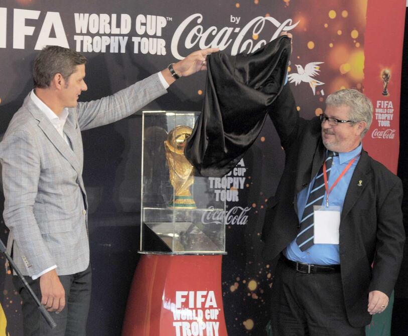 El seleccionador de Ecuador, Reinaldo Rueda, y el presidente de la Ecuafútbol, Luis Chiriboga, evidenciaron su emoción el pasado sábado cuando la Copa del Mundo de la FIFA fue exhibida en el aeropuerto Mariscal Antonio José de Sucre.