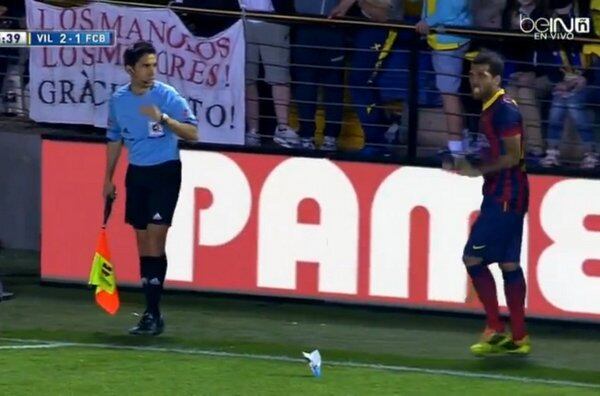 No fue una imagen curiosa, fue sorprendente. Dani Alves reaccionó con "humor" a un gesto de racismo durante el partido de su equipo FC Barcelona frente al Villarreal, en el estadio El Madrigal.