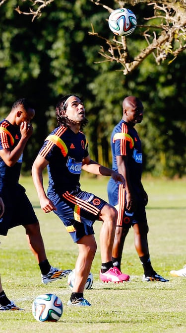 Radamel Falcao García, delantero estrella de Colombia, que se recupera de una operación en una rodilla, pudo entrenarse con pelota, aunque en una práctica diferente a la que realizan sus compañeros antes del Mundial Brasil 2014.