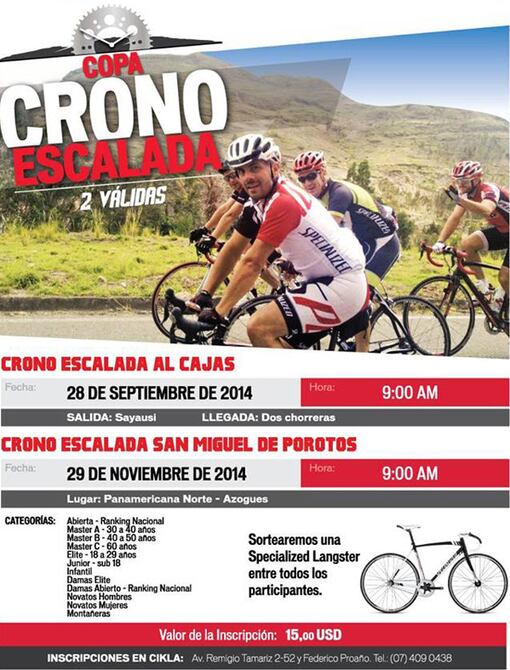 DOMINGO. La Crono Escalada a El Cajas (Azuay) se iniciará a las 09:00. La salida será en Sayausí y la llegada, en Dos Chorreras. Las categorías son abierta, masters, élite, júnior, infantil y damas. La segunda válida será el 29 de noviembre. Inscripciones en Cikla Cuenca ($ 15).