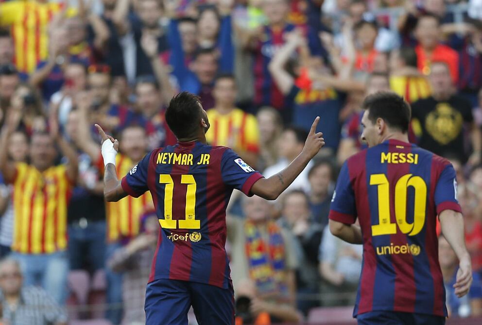El FC Barcelona recuperó el liderato al golear este sábado al Granada (8º) por 6-0, con un triplete del brasileño Neymar, un doblete del argentino Lionel Messi y un tanto del croata Ivan Rakitic, en la sexta jornada de la Liga española.