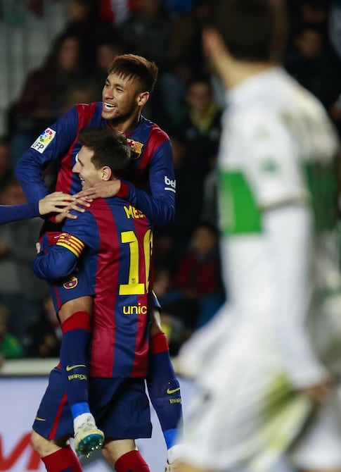El FC Barcelona mantiene el pulso en la Liga tras golear al Elche en el Martínez Valero (0-6) en un encuentro que se abrió definitivamente para el conjunto catalán tras el gol de penalti de Messi y la expulsión de Fayal en la segunda parte.