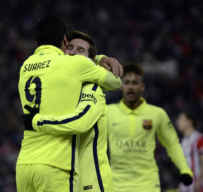 El FC Barcelona goleó el domingo como visitante al Athletic de Bilbao por 5-2, con anotaciones del argentino Lionel Messi, del uruguayo Luis Suárez y el brasileño Neymar, resultado que le permite seguir al acecho del líder Real Madrid.