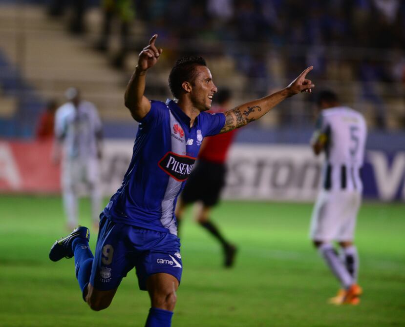 El argentino Emanuel Herrera y el ecuatoriano Miler Bolaños marcan las anotaciones con la que Emelec derrotó 2-0 a Atlético Nacional en el duelo de ida por los octavos de final de la Copa Libertadores, en el estadio Jocay de Manta.