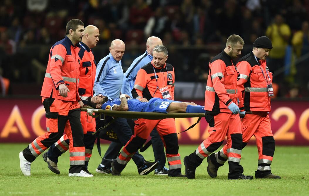 El brasileño Matheus Leite Nascimento, jugador del Dnipro ucraniano, se desvaneció en el minuto 87 de la final de la Liga Europa contra el Sevilla en Varsovia y fue trasladado a un hospital de Varsovia, ya consciente, con fractura de los huesos propios de la nariz.