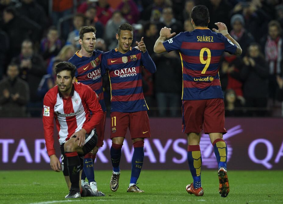 El FC Barcelona (2º) aplastó al Athletic Club (6-0), con tres tantos del uruguayo Luis Suárez, este domingo en la 20ª jornada de la Liga Española, con lo que pudo mantenerse a dos puntos del líder Atlético de Madrid, que había ganado poco antes por 3 a 0 en Las Palmas.