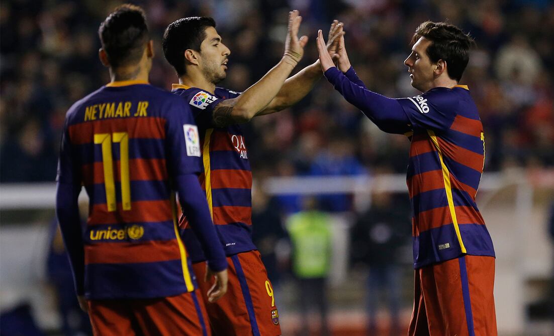 El líder Barcelona, guiado por un triplete de Lionel Messi, resistió bien la presión y se impuso sin sufrir en el campo del Rayo Vallecano, 1-5, ayer en el cierre de la 27ª jornada de la Liga española, con lo cual batió el récord de partidos invicto de un club español.