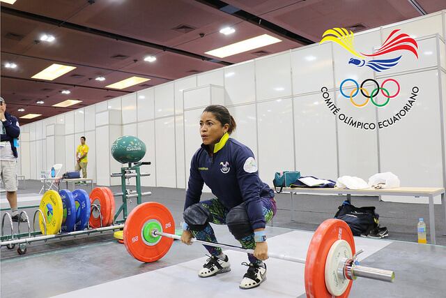Los ecuatorianos Neisi Dajomes, Alexandra Escobar y Fernando Salas realizaron su rutina de levantamiento de pesas enfocados en las pruebas que inician la próxima semana.