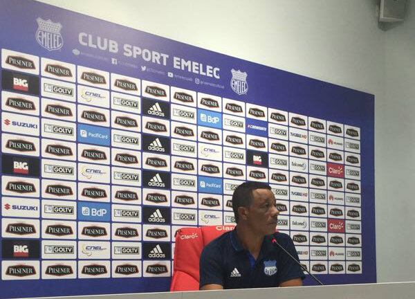 El asistente técnico de Emelec, Héctor Rodríguez, fue el encargado de dar la rueda de prensa luego de la victoria de los azules 2-1 a Liga de Quito en el estadio Capwell.