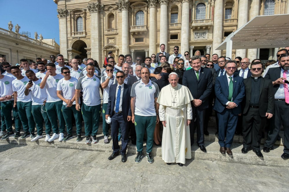 El plantel del Chapecoense de Brasil, junto con los tres sobrevivientes de la tragedia (Ruschel, Jackson Follmann y Helio Neto) visitaron al Papa luego de terminar la audiencia general celebrada en la Plaza de San Pedro. El Papa saludó también al resto de la "nueva" plantilla del club verde, además de varios familiares de las víctimas, publicó Infobae.