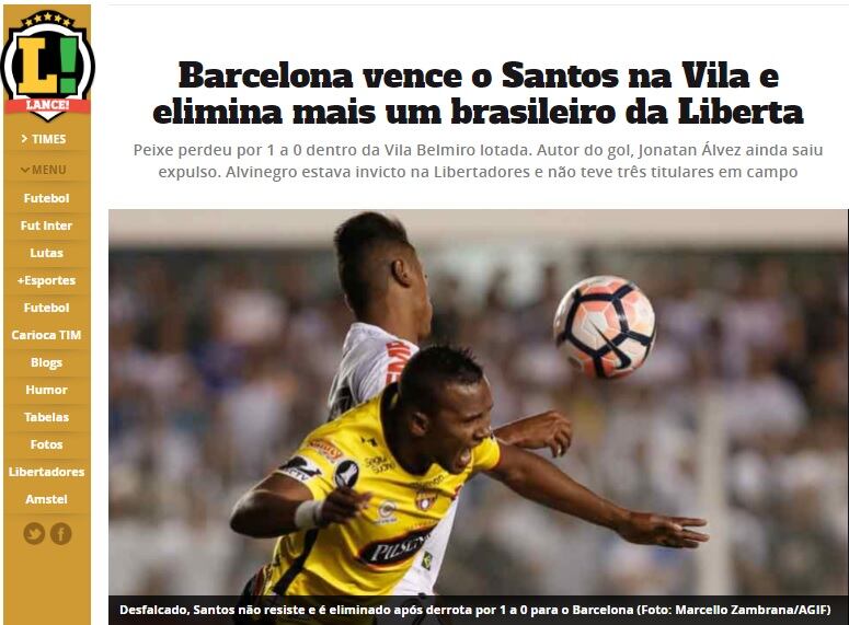 La prensa brasileña destacó anoche el triunfo de Barcelona como visitante ante Santos por 1-0, y con ello su paso a las semifinales de la Copa Libertadores 2017.