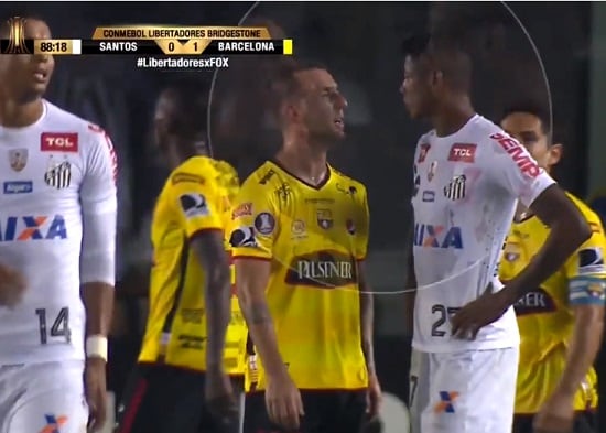 El delantero brasileño, Bruno Henrique, quien fue el autor del gol del Santos en el estadio Monumental en el partido de ida de los cuartos de final de Copa Libertadores, terminó expulsado después de escupir a Damián Díaz anoche en el estadio Vila Belmiro de Brasil.