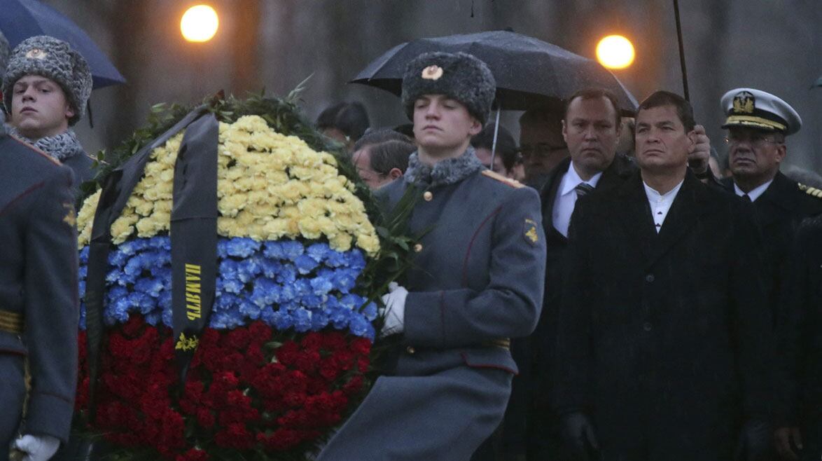 El presidente de Ecuador, Rafael Correa, inició este lunes su visita a Rusia con una ofrenda floral al pie de la Llama Eterna del cementerio Piskariov de San Petersburgo, donde yacen las víctimas del sitio de la ciudad (entonces Leningrado) durante la Segunda Guerra Mundial.