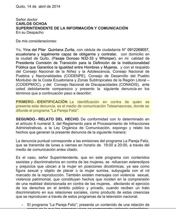 El superintendente de Comunicación, Carlos Ochoa, precisó que la institución que él dirige solo había recibido una denuncia por supuestos contenidos discriminatorios en la televisión nacional hasta el pasado lunes.