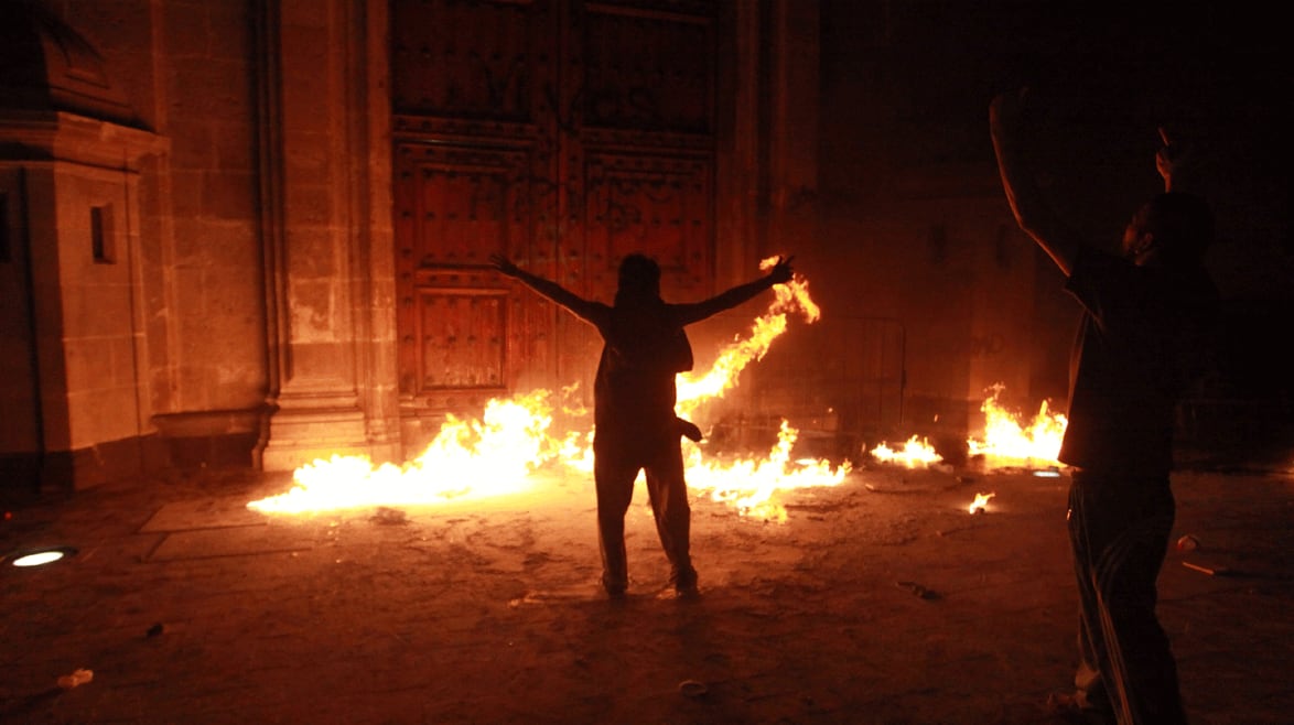 Un grupo de manifestantes trató de romper e incluso de quemar la puerta principal del palacio nacional durante una tensa manifestación este sábado en el centro de Ciudad de México por la desaparición de 43 estudiantes, constató la AFP.