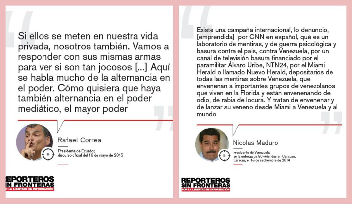 Los presidentes de Venezuela, Nicolás Maduro; Ecuador; Rafael Correa, y Honduras, Juan Orlando Hernández, figuran en una lista de dirigentes mundiales que han denigrado, insultado o acusado a representantes de la prensa, publicada hoy por Reporteros sin Fronteras (RSF).