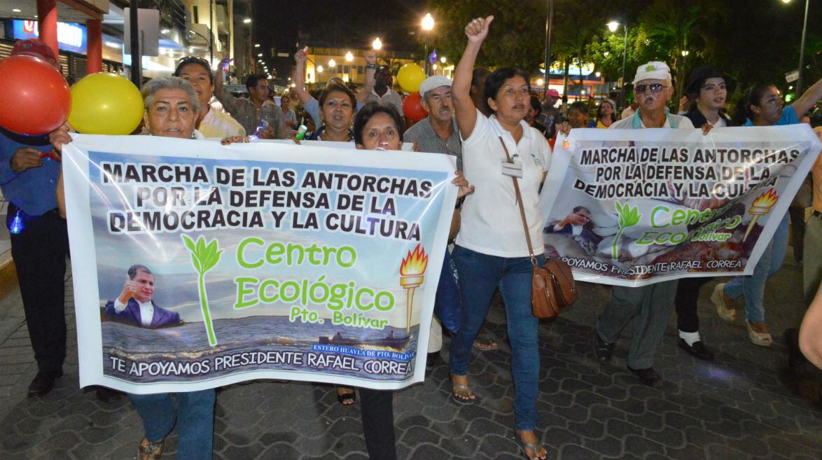 Varias organizaciones participaron este miércoles en la denominada Marcha de las Antorchas en defensa del Gobierno Nacional, en Machala. Los participantes salieron desde el parque Diego Minuche Garrido y avanzaron por la avenida 25 de Junio hasta los exteriores del ECU 911, donde tenían previsto realizar actos culturales.