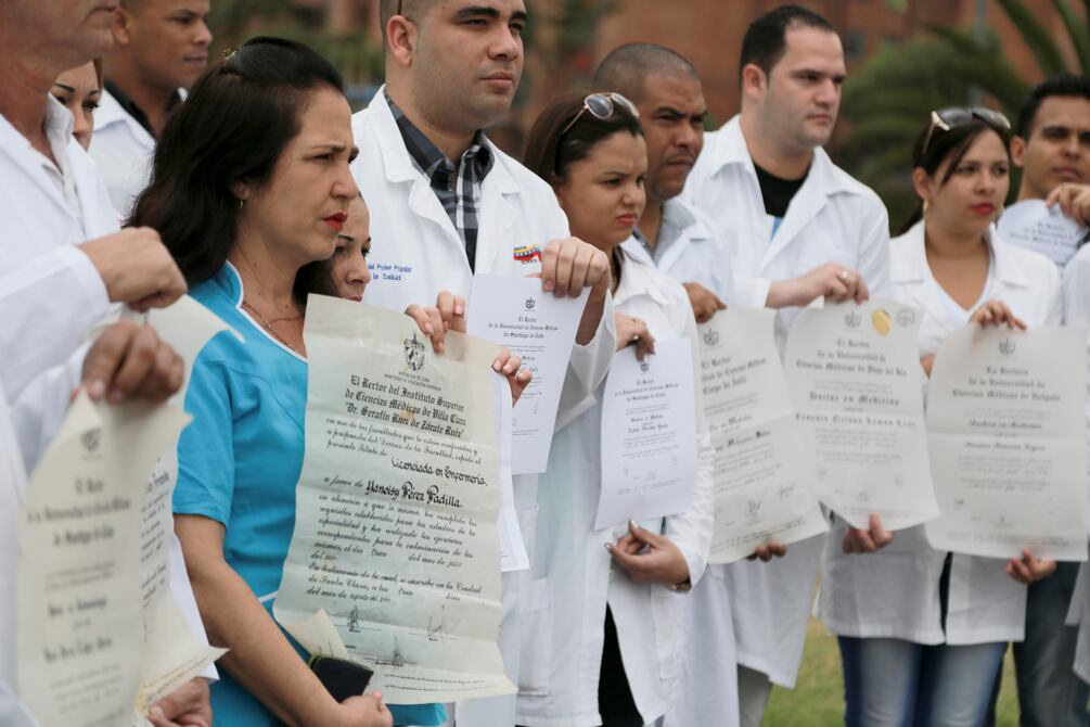 Al menos 100 médicos cubanos, muchos de los cuales desertaron de misiones humanitarias en Venezuela, protestaron el sábado luego de pasar meses varados en Bogotá a la espera de que Estados Unidos les otorgue una visa especial.