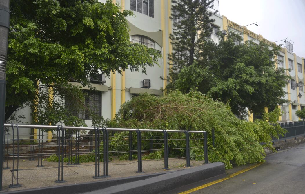 En las calles Boyacá entre Clemente Ballen y 10 de Agosto, en el centro de Guayaquil, varios árboles que cayeron fueron sostenidos por los edificios cercanos. El paso por el carril de la metrovía fue interrumpido.