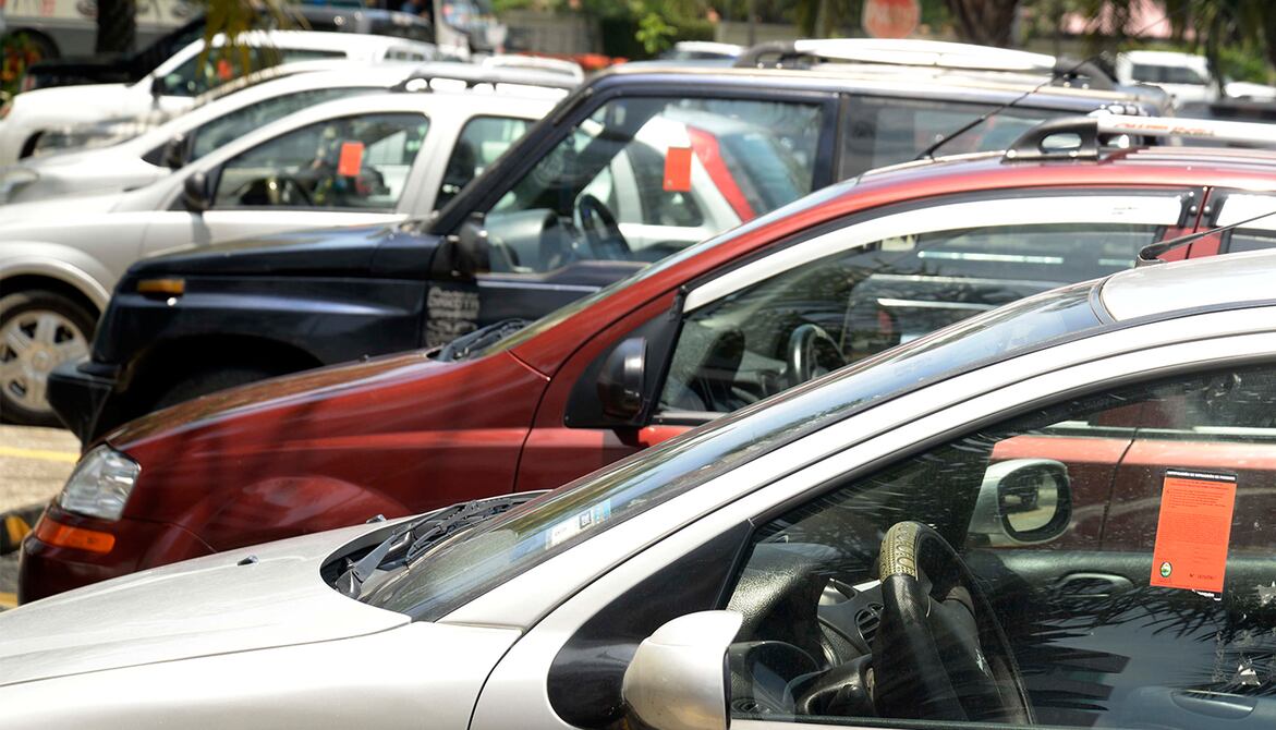 Más de 20 vehículos tenían adheridos en las ventanas, al mediodía de ayer, el sticker naranja que notificaba de una infracción: parqueo con tiempo excedido y no pagado (en el taxímetro).