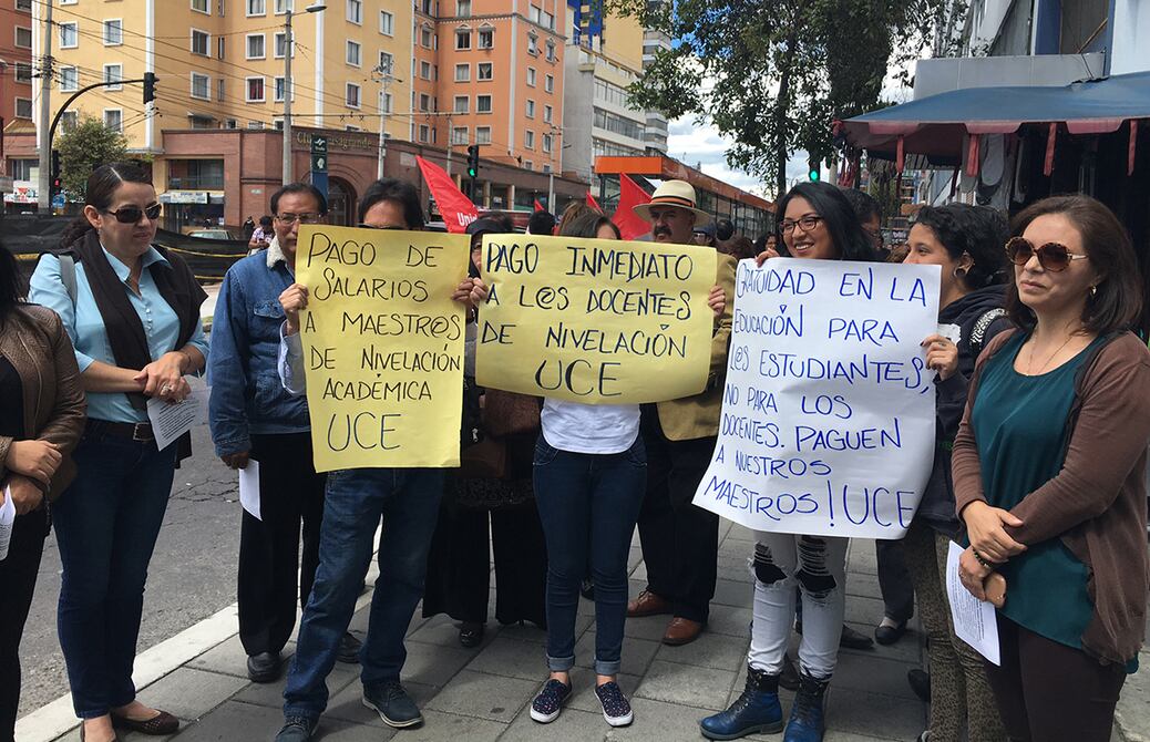 Un grupo de docentes de la Universidad Central, proveedores de equipos de computación y de artículos de aseo protestaron ayer frente al Ministerio de Finanzas por el pago de sus haberes adeudados, según dijeron, desde el año pasado.