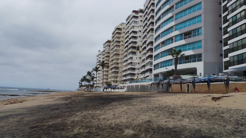 Olores a hidrocarburo y arena negra tomaron por sorpresa a bañistas que llegaron al sector de la playa frente a Petrópolis, una zona donde están ubicados los primeros edificios de Salinas y que quedan cercanos al puerto de Santa Rosa y a un área en la que hay máquinas de explotación petrolera.