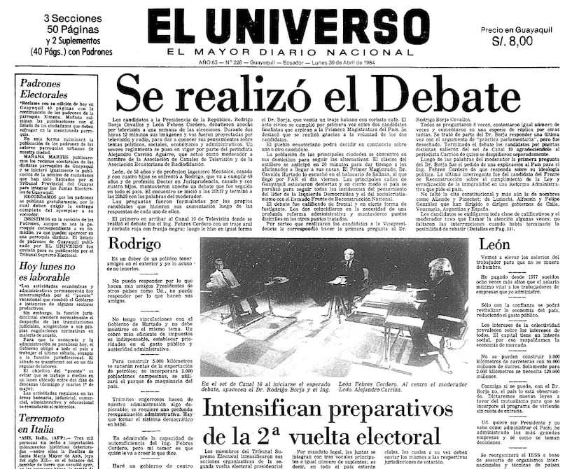 Tras culminar el periodo restante de Osvaldo Hurtado, quien se hizo cargo de la Presidencia del Ecuador por el accidente aéreo que sufrió y donde falleció Jaime Roldós (+1981), la ciudadanía se preparaba para unas nuevas elecciones en mayo de 1984. Esta vez nueve candidatos se postularon para los comicios. León Febres-Cordero por el Partido Social Cristiano; Rodrigo Borja por Izquierda Democrática; Ángel Duarte Valverde por el partido Concentración de Fuerzas Populares; Julio César Trujillo por Democracia Popular; Jaime Hurtado líder del Movimiento Popular Democrático; René Maugé por el Frente Amplio de Izquierda; Jaime Aspiazu por el Frente Radical Alfarista; Francisco Huerta por el partido Demócrata y Manuel Salgado por el Partido Socialista Ecuatoriano. De todos estos aspirantes, dos pasaron a segunda vuelta: Febres-Cordero y Borja.
