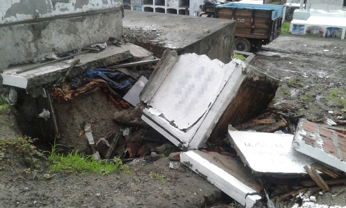 La fuerza de la lluvia arrasó con lo que estaba al paso en varias poblaciones de Manabí. Ni las tumbas se salvaron de ser afectadas por la potencia de la naturaleza. Y ese fue el caso de dos tumbas que colapsaron tras el fuerte aguacero caído la madrugada del miércoles en el cementerio de Montecristi.