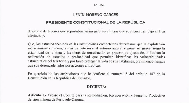 El presidente de la República, Lenín Moreno, firmó hoy el decreto ejecutivo 169 en el cual crea el Comité para la Remediación, Recuperación y Fomento Productivo del área minera de Portovelo-Zaruma.