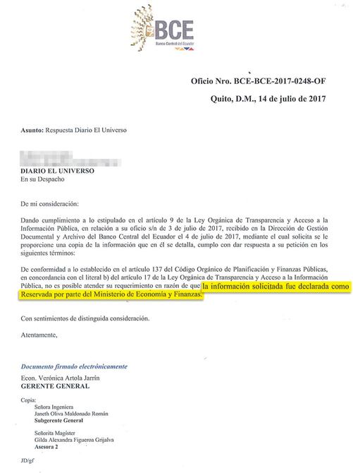El Ministerio de Economía y Finanzas (MEF) guarda en secreto las operaciones de los créditos otorgados por China. Esa cartera de Estado declaró la reserva de esa información basándose en el artículo 137 del Código Orgánico de Planificación y Finanzas Públicas, aprobada en el 2010.