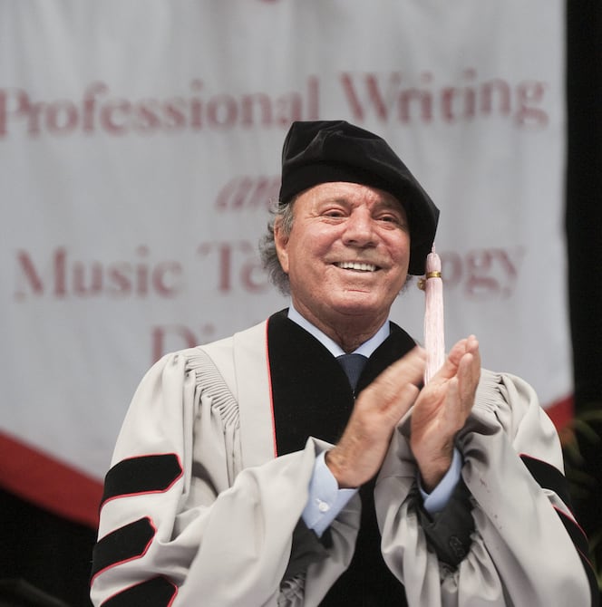 El cantante español Julio Iglesias se sentó junto a 900 estudiantes, de 62 países, que la noche del sábado se graduaban en el prestigioso Berklee College of Music de Boston (EE.UU.). En la ceremonia, la entidad universitaria reconoció al artista de 71 años con el título de doctor honoris causa.