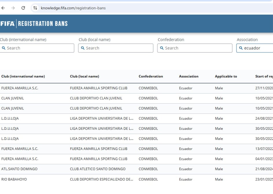 Al ingresar al FIFA Ban Portal y revisar el listado de clubes sancionados de Ecuador, Emelec ya no aparece en el registro, cuando semanas atrás figuraba con múltiples prohibiciones de inscripción.