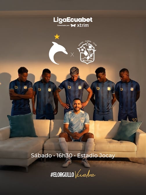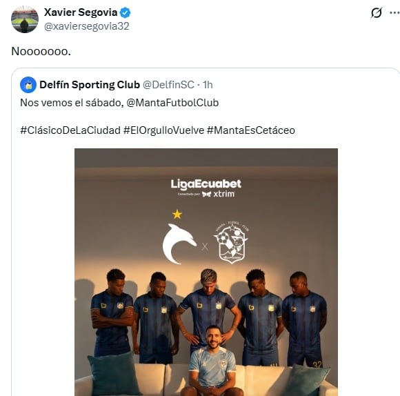 “Nos vemos el sábado, Manta FC”, publicó en sus redes sociales el cuadro cetáceo, adjuntando una curiosa imagen en la que aparece un futbolista atunero sentado en un sofá, mientras cinco jugadores del Delfín SC lo observan.