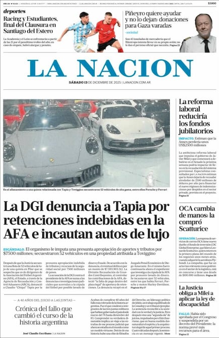 Las actuaciones judiciales encabezan todos los medios días tras día en la Argentina. “Tapia está desesperado. Recibió un golpe político de nocaut, se verá hasta dónde le pega judicialmente”, tituló su columna Ricardo Roa, editor general adjunto del diario Clarín. “Menos sexo y arrepentidos, al menos hasta hoy, la película de la corrupción en AFA trae de todo. Una financiera denunciada por la AFIP por mover 820.000 millones de pesos, sobornos, lavado de dinero, un ejército de testaferros, runflas y empresas que se arman y desarman para no dejar rastros sobre quiénes son sus verdaderos dueños. Y, en Miami, más negocios con Sur Finanzas, la financiera que le dio a Tapia una tarjeta corporativa, que planeó montar un restorán y lanzar una tarjeta Mastercard con la cara de Messi. Más: un avión privado con matrícula de San Marino, una mansión de capo narco con haras para caballos árabes, una flota de 54 vehículos, un helipuerto y hasta una retroexcavadora”, escribió el número dos del poderosísimo medio argentino.