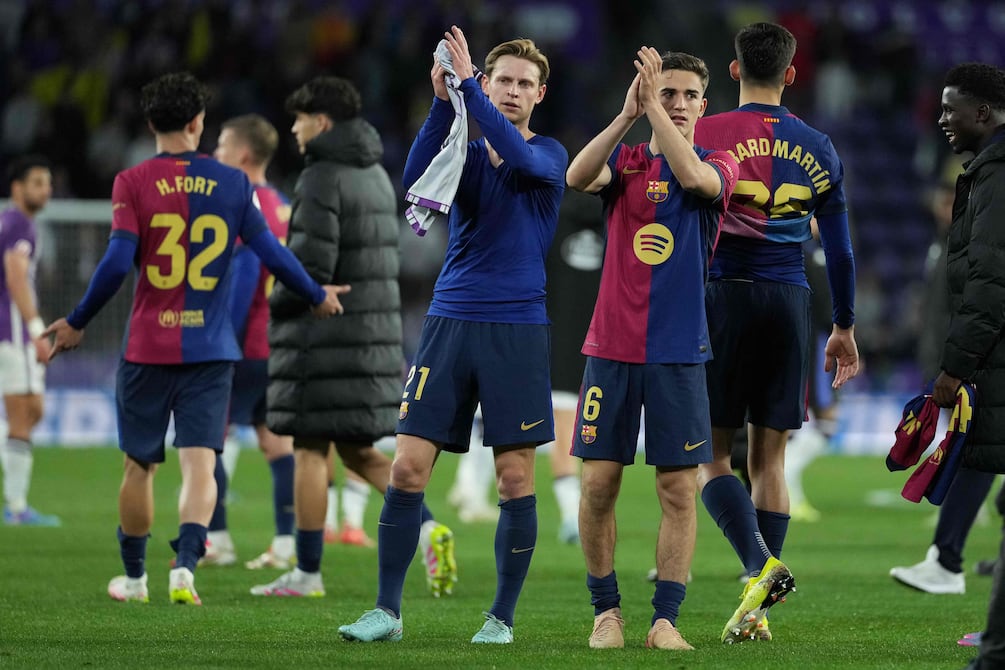 Aunque con más sudores de los previstos, el FC Barcelona cumplió su doble objetivo este sábado en su visita al colista y ya descendido Valladolid: Ganó (2-1) para mantener a raya al Real Madrid (2º) y dosificó a sus piezas clave para la vuelta de semifinales de Champions.