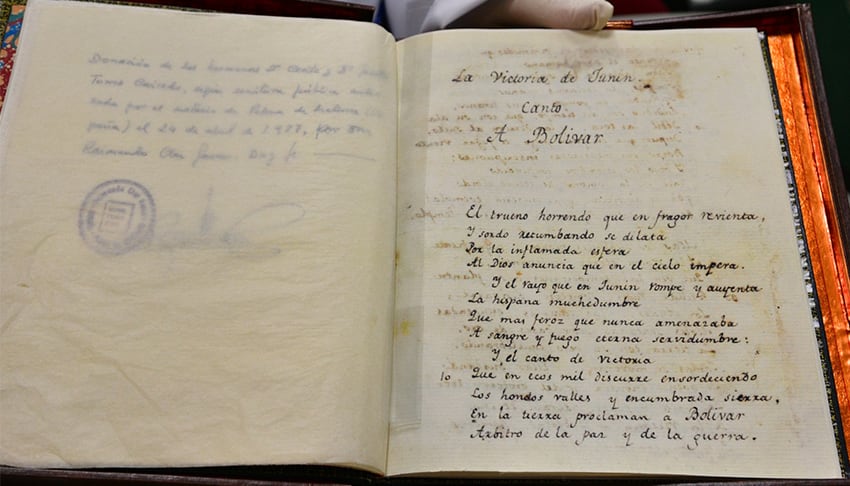 La Organización de las Naciones Unidas para la Educación, la Ciencia y la Cultura (Unesco) incluyó el manuscrito Victoria de Junín, Canto a Bolívar, de José Joaquín de Olmedo, en el Registro Memoria del Mundo de América Latina y el Caribe.